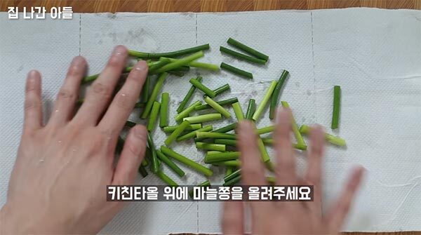 3. 키친타올 위에 마늘쫑을 올려주고 물기를 제거해 줍니다.